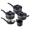 As panelas têm revestimento interno antiaderente super resistente que propaga o calor com maior eficiência.