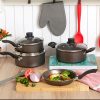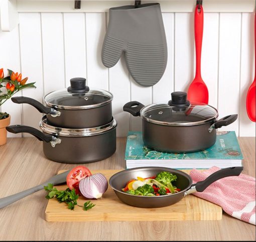 O Conjunto de Panelas Antiaderente possui tampa de vidro temperado de alta resistência com saída de vapor e alças anatômicas facilitando o manuseio.