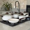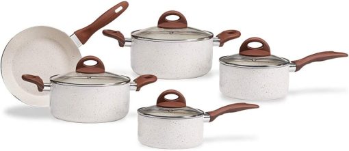 DIFERENCIAL:O Jogo de panelas 5 peças possui estrutura em alumínio, facilitando o cozimento uniforme. Revestimento cerâmico não deixa o alimento grudar, facilita a limpeza e é livre de metais pesados e elementos prejudiciais a saúde (PFOA free).