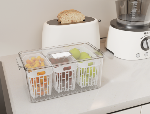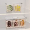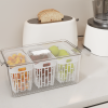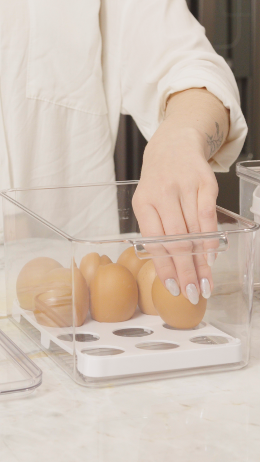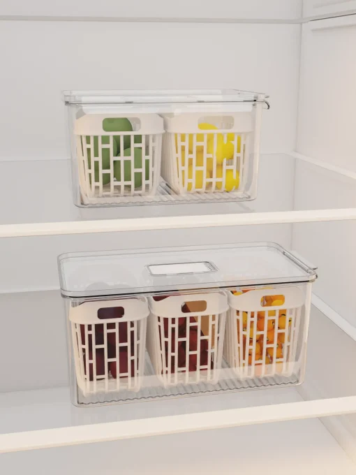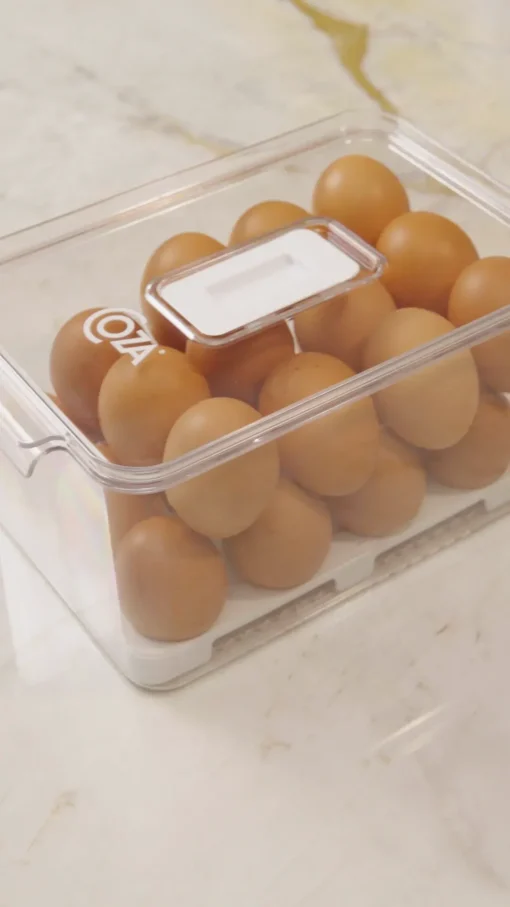 DIFERENCIAIS: Com seu design requintado e compromisso ecológico, esses organizadores de geladeira são fabricados em Polietileno Tereftalato (PET) de alta qualidade, 100% recicláveis e com aspecto de vidro, tornando-os leves e fáceis de limpar. Suas alças laterais discretas oferecem transporte seguro e confortável, enquanto os cestos internos na cor branca possuem a função de escorredor para manter os alimentos sempre frescos. A tampa com respirador integrado permite a circulação de ar, garantindo a conservação adequada dos mantimentos.