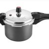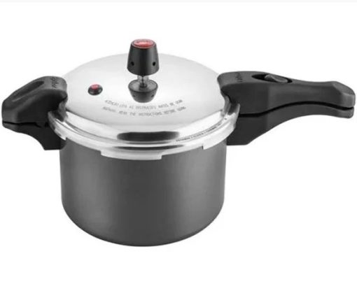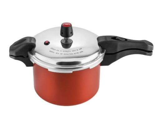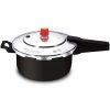 1. Panela de pressão com acabamento interno e externo em antiaderente de 5 camadas.